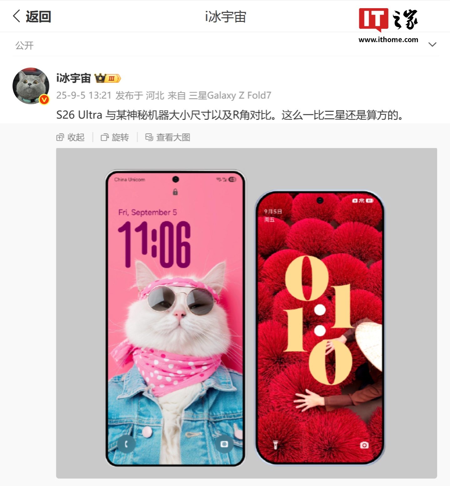 IT之家 9 月 6 日消息,消息源 @i冰宇宙 昨日(9 月 5 日)发布微博,分享了一张“神秘手机”的渲染图,并对比了三星 Galaxy S26 Ultra 的尺寸和 R 角,结合用户评论等信息,预估为小米 16 手机。